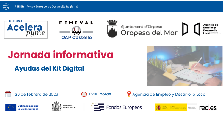 La Oficina Acelera Pyme Castelló – FEMEVAL, en colaboración con el Ayuntamiento de Oropesa del Mar, organiza la jornada “Impulsa la Digitalización de tu PYME con financiación pública – Ayuda KIT DIGITAL”, una sesión informativa dirigida a pymes, personas autónomas y emprendedoras interesadas en avanzar en la transformación digital de sus negocios.