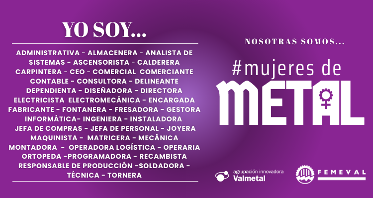 Con motivo del 8M - Día Internacional de la Mujer, FEMEVAL lanza la campaña “YO SOY… SOLDADORA, ELECTRICISTA, INGENIERA… Nosotras somos #MujeresdeMetal”, para visibilizar la diversidad de profesiones que desempeñan las mujeres en el sector metal. El objetivo es mostrar la pluralidad de perfiles profesionales femeninos que ya forman parte del sector para romper estereotipos y generar referentes que animen a otras mujeres a contemplar el metal como una opción laboral llena de oportunidades, estabilidad y proyección de futuro.