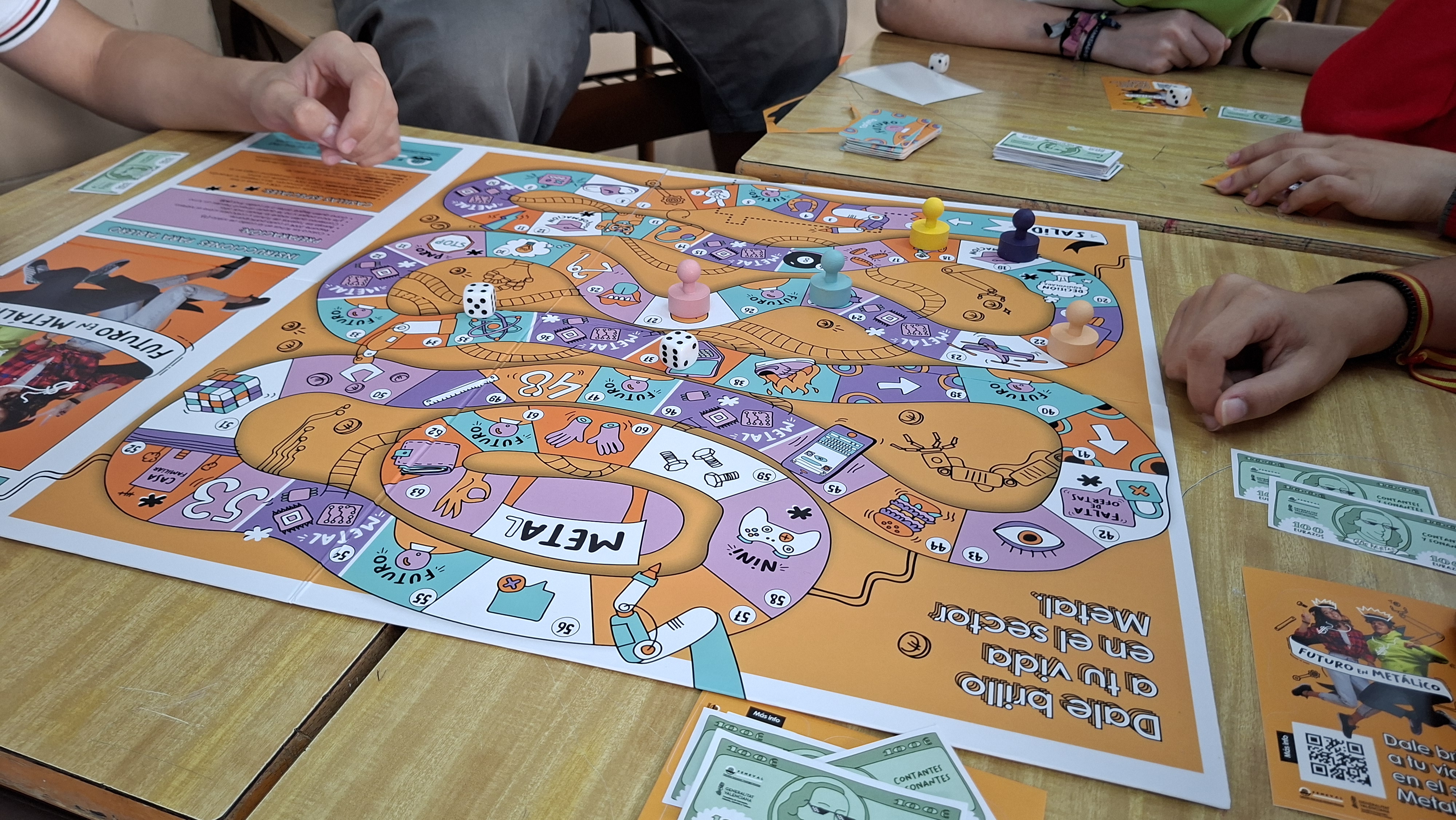 FEMEVAL ha trasladado este mensaje a los centros educativos con una fórmula que conecta con el lenguaje juvenil: una dinámica gamificada inspirada en el Monopoly y el Juego de la Oca, donde el alumnado es protagonista. El tablero representa un recorrido hacia el éxito profesional y está dividido en 63 casillas con “tarjetas de futuro” que plantean decisiones acertadas o erróneas sobre la vida laboral. Las malas jugadas implican perder dinero o turnos; las buenas —ligadas a la FP Metal— premian con recursos económicos y puntos de experiencia vital.