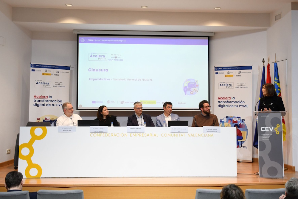 La secretaria general de FEMEVAL ha cerrado el encuentro agradeciendo la sólida red de cooperación que da respaldo a la OAP formada por más de 60 organizaciones empresariales, institutos tecnológicos, ayuntamientos y mancomunidades como CEV, CONFECOMERÇ, AIDIMME, ASECAM, AVETIC, AVEO, FAES, COEVAL, FEVAMA, ASELEC, ASEIF, VALMETAL, ITI, ITE o AIMPLAS, entre muchas otras.